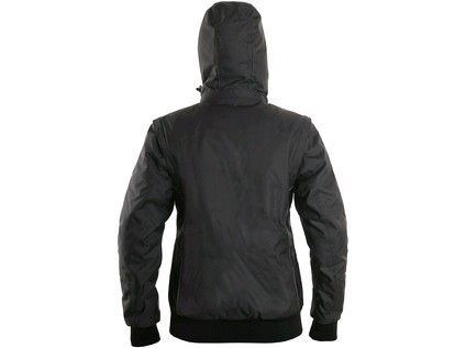 Dámská zateplená bunda 2 v 1, zapínaní na zip krytý légou, odepínací kapuce, fleecový límec, odepínací rukávy, rukávy a dolní okraj bundy ukončeny pružnou manžetou, plastové poutko pod pravou náprsní kapsou, lepené švy, reflexní doplňky. Kapsy: 2 náprsní kapsy, 2 boční kapsy na zip, 1 vnitřní kapsa.
