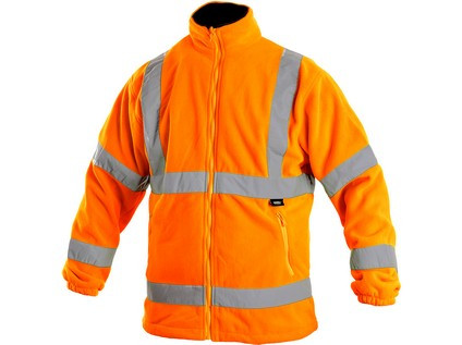 Pánská výstražná fleecová bunda s reflexními pruhy. Rukávy do gumy, boční i náprsní kapsy na zip, stahování v dolním okraji, podšívka ze síťoviny. Doporučené použití: stavebnictví, silničáři, řidiči, letecká a lodní doprava, logistika, řidiči kamionů, policie, záchranáři.