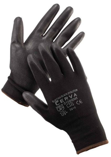 Pletené bezešvé polyesterové, rukavice s tenkou vrstvou polyuretanu v dlani a na prstech a pružnou manžetou.