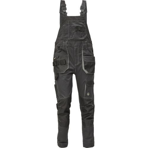 pánské pracovní kalhoty s laclem, elastický inovativní materiál TRIFIBETEX®, ergonomický střih, pružný pas, odolné trojité prošití nohavic a sedu, zesílená oblast kolen s možností vkládání kolenních výztuh, prostorné multifunkční přední kapsy s poutky na nářadí, 2 zadní kapsy s klopou zesílené Oxfordem, stehenní kapsa na telefon s klopou a zapínáním na suchý zip, kapsa na metr a nůž, poutko na kladivo, "D" kroužek, poutko na nářadí v pase, originální zpracování zapínání kalhot, reflektivní prvky v barevném odstínu, nastavitelná délka nohavic