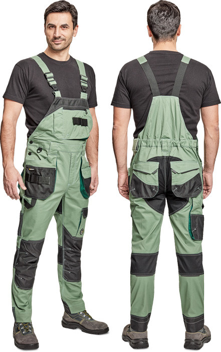 pánské pracovní kalhoty s laclem, elastický inovativní materiál TRIFIBETEX®, ergonomický střih, pružný pas, odolné trojité prošití nohavic a sedu, zesílená oblast kolen s možností vkládání kolenních výztuh, prostorné multifunkční přední kapsy s poutky na nářadí, 2 zadní kapsy s klopou zesílené Oxfordem, stehenní kapsa na telefon s klopou a zapínáním na suchý zip, kapsa na metr a nůž, poutko na kladivo, "D" kroužek, poutko na nářadí v pase, originální zpracování zapínání kalhot, reflektivní prvky v barevném odstínu, nastavitelná délka nohavic
