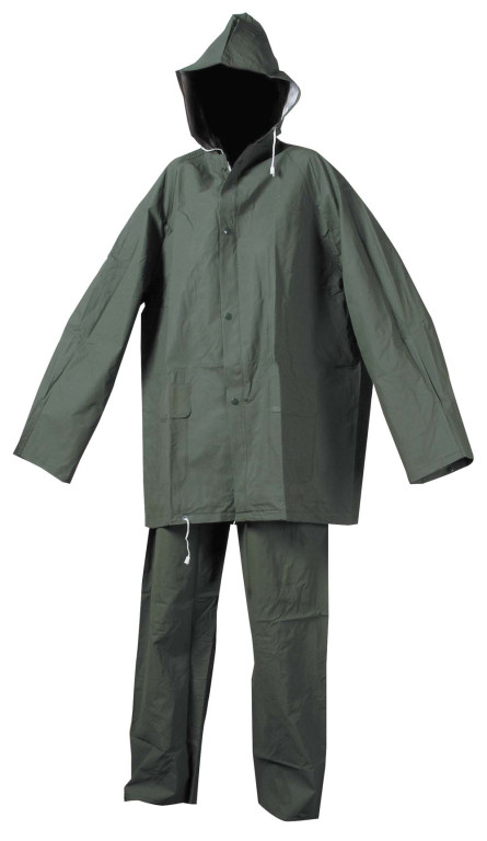 • voděodolný dvoudílný oblek – ¾ plášť s kapucí a kalhoty v pase na gumu • všechny spojovací švy jsou zatavené • materiál s nánosem PVC • dvě přední kapsy kryté légami proti průniku vody • spodní část rukávů lze regulovat drukem • ventilace na zádech a v podpaží