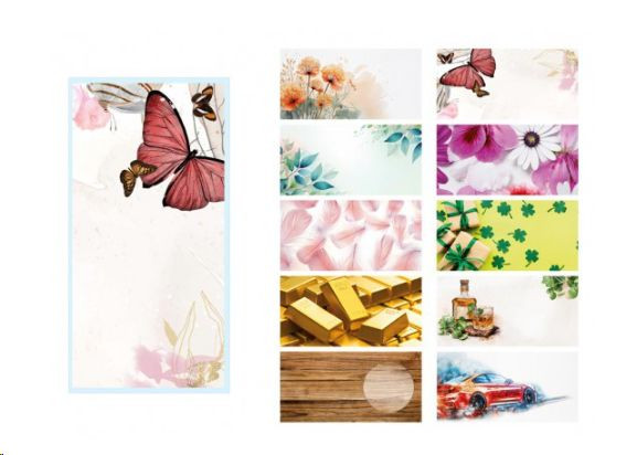 Celoplošně potištěné dopisní obálky formátu DL s krycí páskou. Různé motivy.