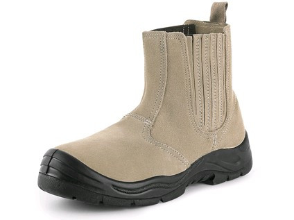 Celokožená kotníková obuv s ocelovou špicí a krytou pružinkou. Materiál: svršek z kvalitní 2 - 2,2 mm hrubé hovězí broušené kůže, krytá gumová pružinka pro rychlé vyzutí, podšívka: 1,2 - 1,4 mm hovězí broušená kůže, podešev: PU-guma, antistatická, olejivzdorná, protiskluzová, odolná vůči kontaktnímu teplu do 300 °C.