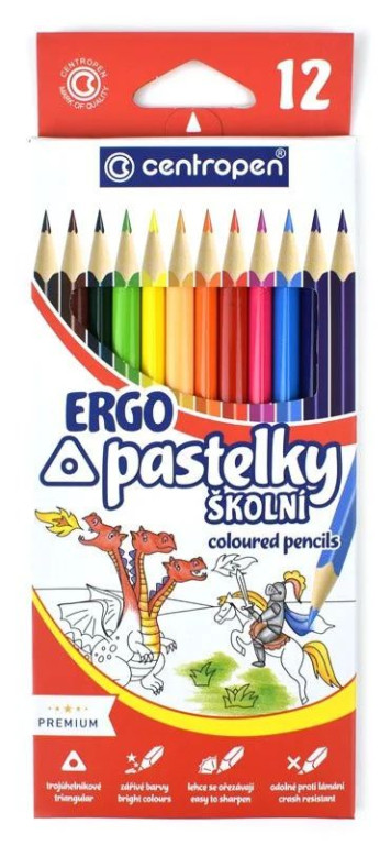 Trojúhelníkové školní pastelky v zářivých barvách. S jemnou tuhou v intenzivních a jasných barvách, dřevo vysoké kvality pro snadné ořezávání, odolné proti lámání. V krabičce 12 barev.