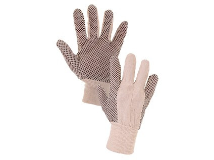 Textilní rukavice šité z bavlněného plátna, dlaň a prsty pokryty PVC terčíky, pružná manžeta. Doporučené aplikace: logistika, skladování, hobby, lehká montáž, zemědělství, zahrada.